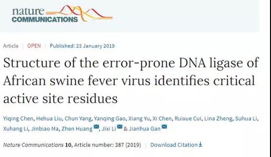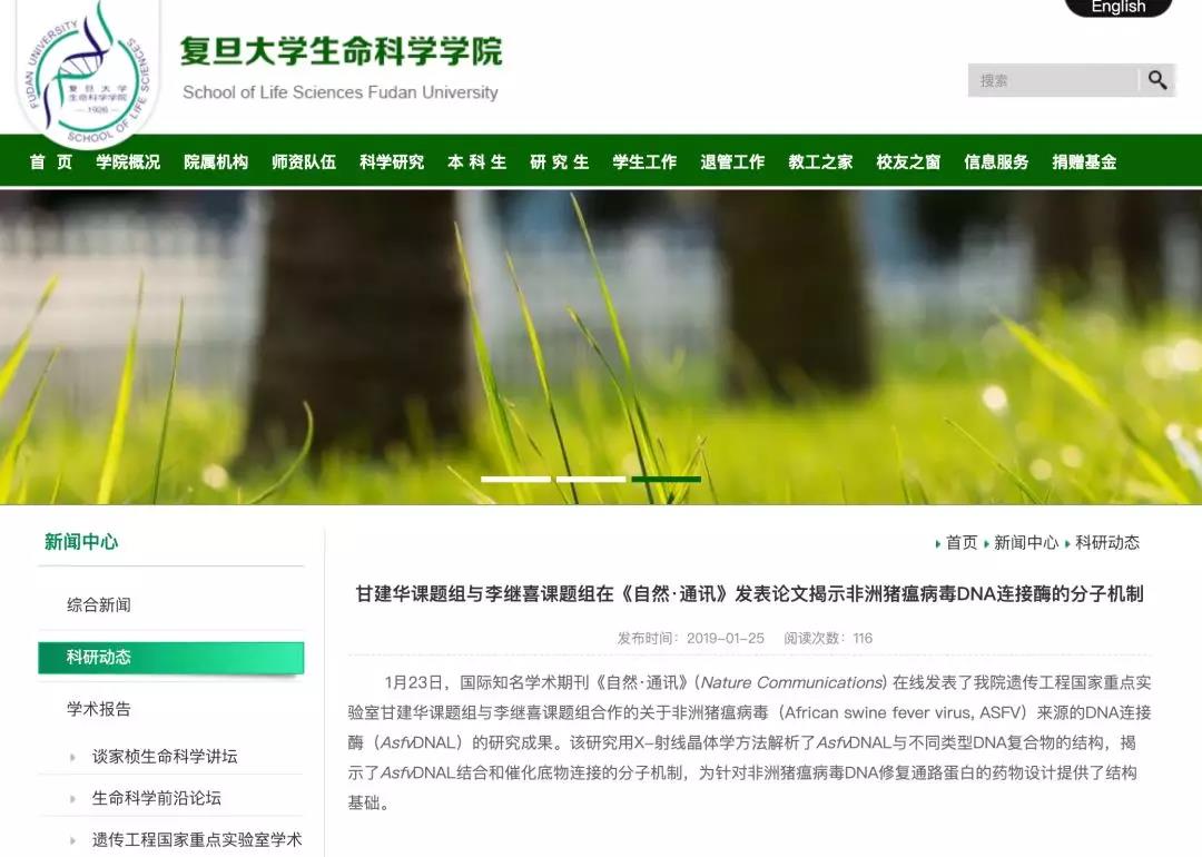 2019年1月23日,國(guó)際知名(míng)學(xué)術期刊《自然·通訊》(Nature Communications) 在線(xiàn)發表了複旦大學(xué)及四川大學(xué)關于非洲豬瘟病毒(African swine fever virus, ASFV)來源的DNA連接酶(AsfvDNAL)的研究成果。