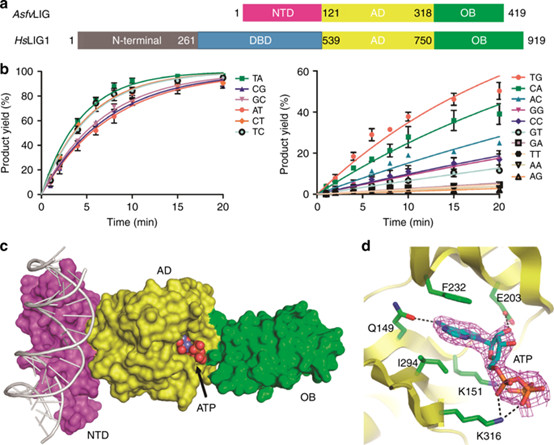 AsfvLIG包含四個獨特的殘基,包括AD域的Asn 153和Leu 211,以及OB結構域的Leu 402和Gln 403。雖然他(tā)們不參與直接催化過程,這些殘基可(kě)能(néng)與其相應的NTD或DBD結構域協同工(gōng)作(zuò),這些位點殘基對缺口的識别和催化效率有(yǒu)着重要的意義。