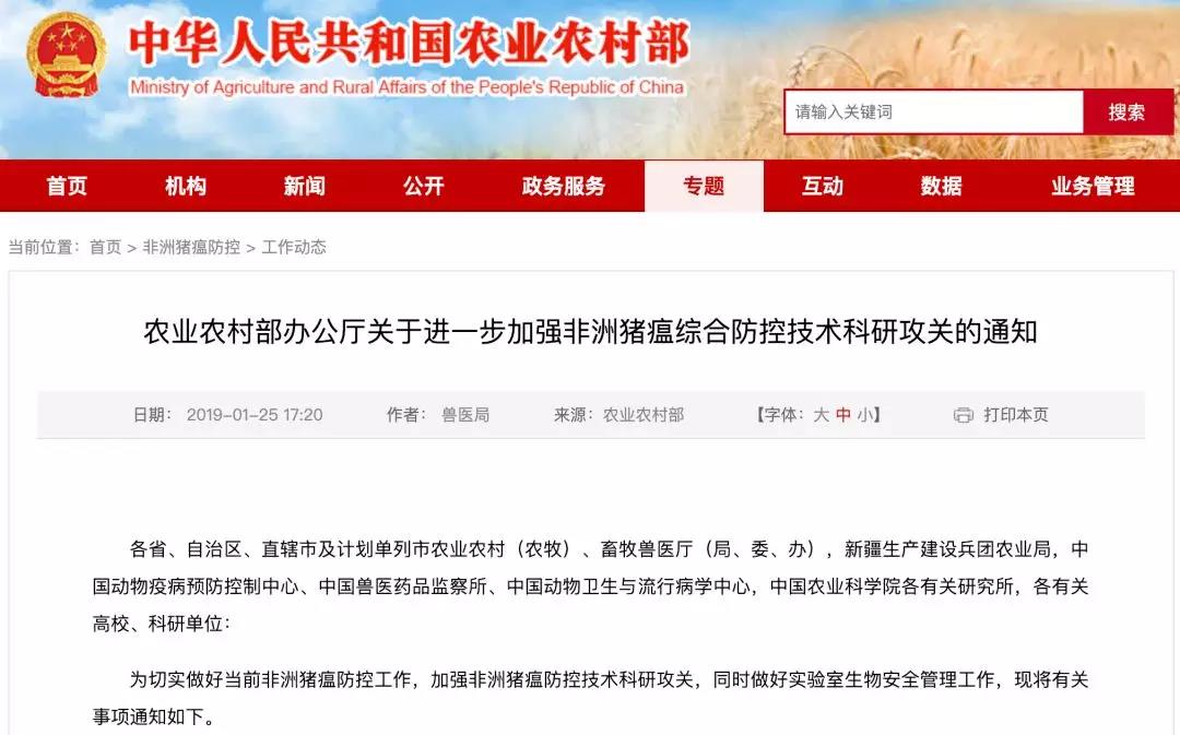 為(wèi)切實做好當前非洲豬瘟防控工(gōng)作(zuò),加強非洲豬瘟防控技(jì )術科(kē)研攻關,2019年1月25日,農業農村部辦(bàn)公(gōng)廳關于進一步加強非洲豬瘟綜合防控技(jì )術科(kē)研攻關的通知,通知要求重點推進非洲豬瘟疫苗創制,積極開展技(jì )術合作(zuò),各級各類農業科(kē)研單位要充分(fēn)利用(yòng)相關高校、科(kē)研院所等單位的技(jì )術和硬件條件,聯合開展技(jì )術攻關,加快研發進程。